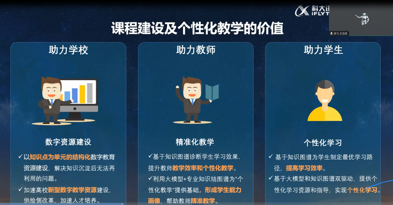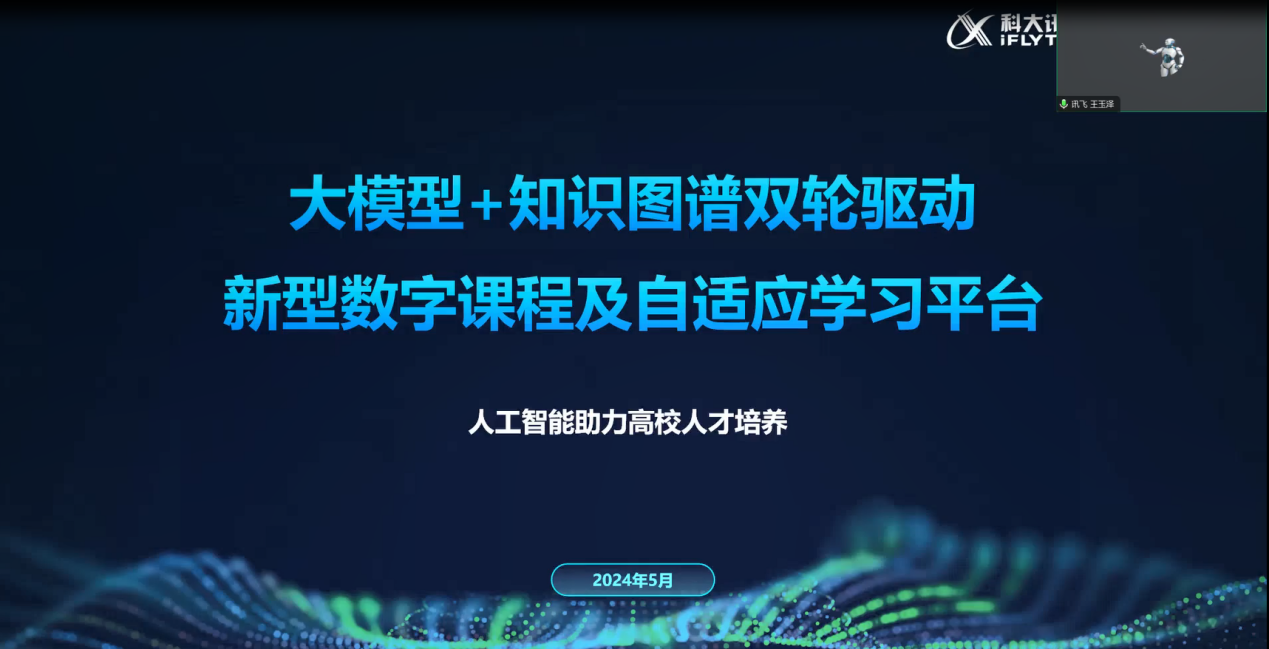 为深化教师对数字时代认识,借助现代科技力量推动课程与教学改革,2024年5月15日14:30,科大讯飞北方方案咨询负责人、人工智能技术高级工程师、高教研究院研究员王玉泽,为江南网页版教师讲授了一场题为《大模型+知识图谱双轮驱动新型数字课程及自适应学习平台——人工智能助力高校人才培养》的线上讲座。