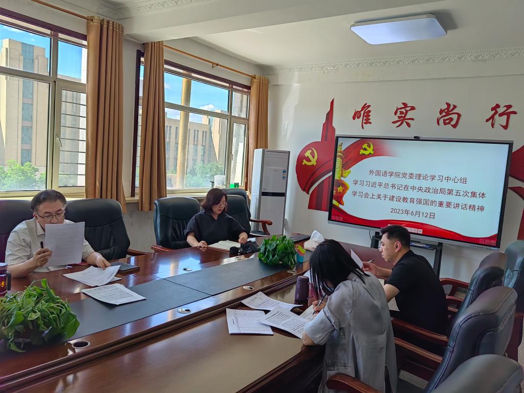 通过学习,大家认识到习近平总书记的重要讲话系统阐述了中国特色社会主义教育强国的丰富内涵,指明了教育强国建设的前进方向。会议指出,站在新的历史方位,应以主题教育为契机,以“五个一”系列实践活动为抓手,探索破解难题的实招、硬招,谋发展、办实事、解难题。一是从立德树人上发力,用习近平新时代中国特色社会主义思想启智润心、培根铸魂;二是从提高人才培养质量上发力,不断完善培养方案,推进专业建设和大学外语教学改革,服务地方经济社会高质量发展。三是从教师队伍建设上发力,加强师德师风建设,做好人才引育工作,助力青年教师成长。四是继续在“以学铸魂、以学增智、以学正风、以学促干”上下功夫,将理论学习转化为推动学院教育事业高质量内涵式发展的生动实践。