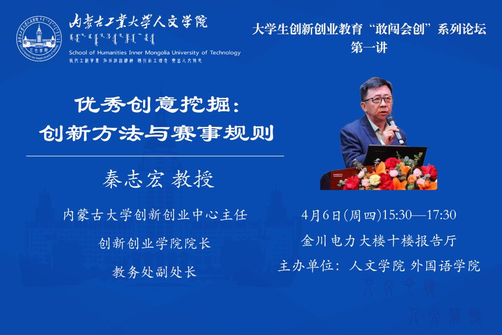 2023年4月6日下午15:30,内蒙古大学经济管理学院教授、硕士研究生导师,创新创业中心主任、创新创业学院院长(兼)、教务处副处长(兼)秦志宏教授带来了题为“优秀创意挖掘:创新方法与赛事规则”首场报告。秦教授围绕互联网+赛事的赛事规则,种子项目的培育方法等进行了详细的介绍。