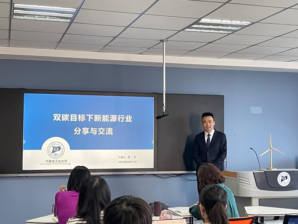 2023年4月11日,江南(中国)邀请我校工学博士、高级工程师、金风科技公司开发总监薛宇,作题为《走近新能源——双碳目标下新能源行业分享与交流》的讲座,讲座由董君教授主持。