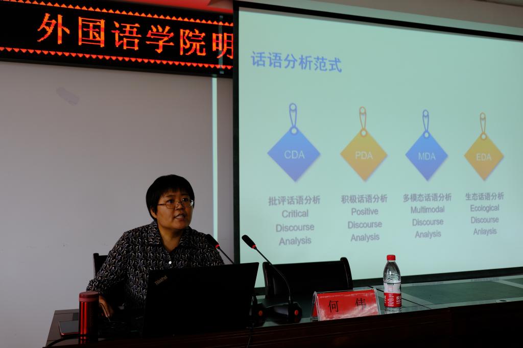 讲座中,何伟教授对比了批评话语分析、积极话语分析、多模态话语分析以及生态话语分析的研究缘起、研究目的、研究范围、研究理论及其研究案例。讲座深入浅出,生动明了,让与会师生详细了解了生态话语分析范式,拓宽了学术视野。