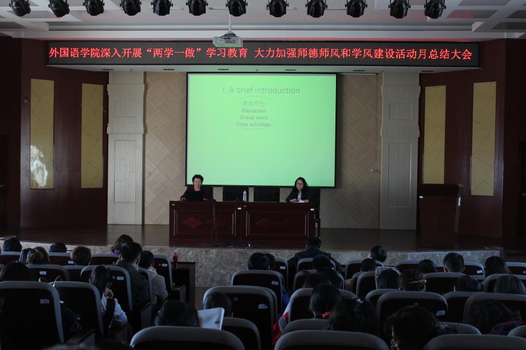 英语系教授陈亚杰以“教师的情怀”为主题,结合自己30余年的从教经历和今年暑期国外学习培训心得,与大家分享了对师德师风的理解和感悟,特别讲解了先进的教学理念和方法,让在场的师生深受启发,深有感触。三位党支部书记介绍了各自支部“两学一做”学习教育的进展,尤其是“师德师风和学风建设活动月”启动以来各项工作开展情况。