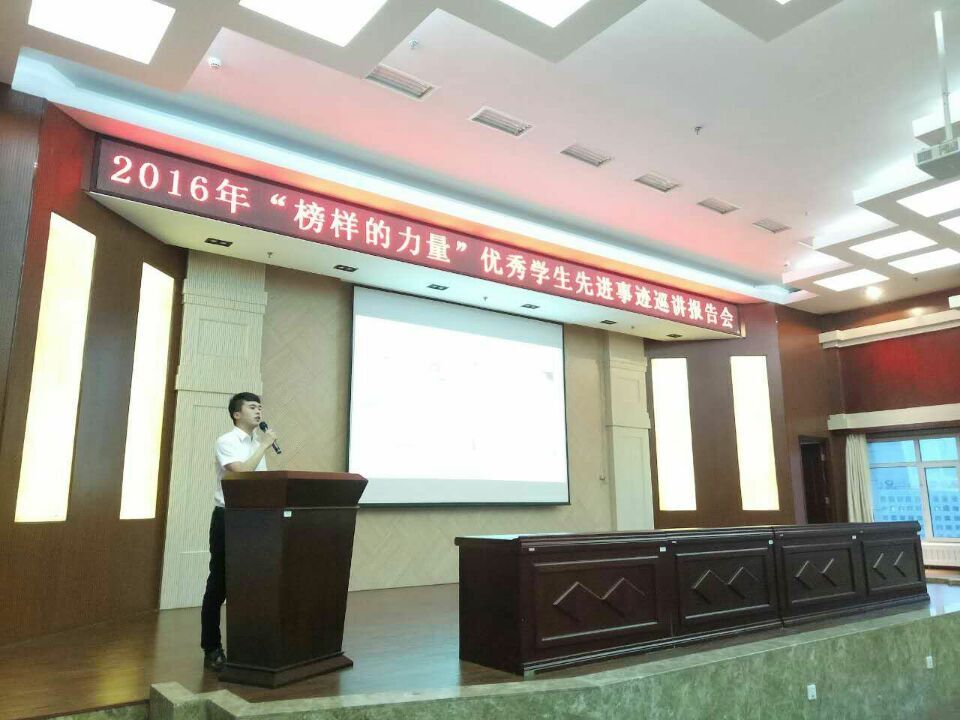 5月10日晚,2016年“榜样的力量”优秀学生先进事迹巡讲报告会江南(中国)专场在电力大楼十楼报告厅如期举行。学生工作处资助管理科李佳、张慧春,以及学院学工办代维东等三位老师出席报告会。学院180余名大一学生聆听了报告。