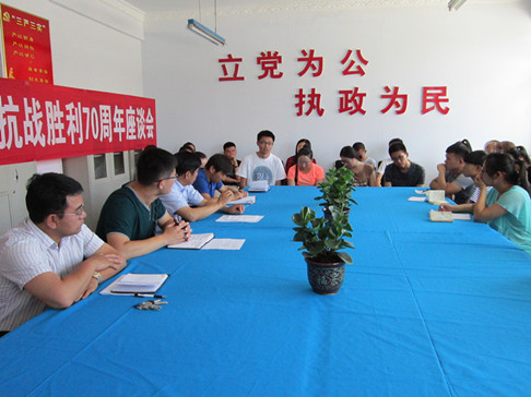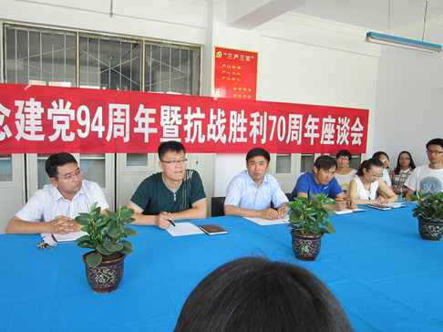7月1日中午,由江南(中国)学生第一党支部、学生第二党支部和研究生党支部联合举办的纪念建党94周年暨抗战胜利70周年座谈会在党员活动室隆重举行。学院所有学生党员、预备党员参加座谈会。学院党委书记霍天瑞应邀出席。座谈会由学院党委组织委员、学生第一党支部书记、学工办主任代维东主持。