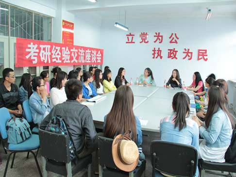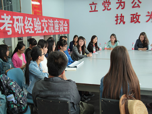 首先分享经验的是高蕾同学。她认为考研的关键是要坚定信心并坚持到底,每天要保证至少有五个小时的复习时间。同时研友是非常重要的,一个好的研友会给自己提供较为丰富的信息。林丽敏同学耐心细致的讲述了她是如何选择适合的学校、专业以及跨专业考研需要注意的问题。张辰阳同学对参考书如何选择做了详细的介绍。吕翠莉同学认为单词记忆量是非常重要的,并推荐了一些考研的书籍。刘昌蕊同学提醒大家,要在理性和慎重思考的基础上,做出是否考研的决定,千万不能随波逐流,迷失了自己的方向。