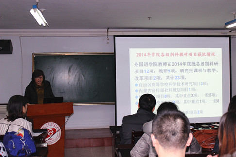 苗凤波、王慧晶等老师做了题为《内蒙古地区高校外语课堂教师行为与职业发展研究》和《美国总统就职演讲中隐喻文本的认知研究》等11篇学术论文及科研、教研项目报告,内容涉及文学、教学研究、教师职业发展等方面,就大学英语教学及英语专业教学所面临的机遇和挑战以及相应的改革与创新方法做了介绍和解读,展示了教师们的研究成果。栗霞和王晓利两位老师及一名研究生就所参加的学术会议做了介绍。