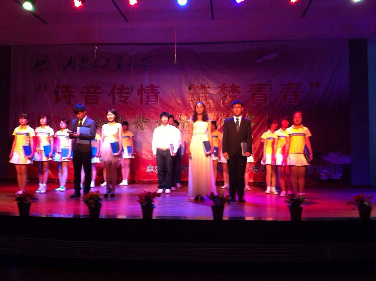 内蒙古工业大学第四届“诗音传情 筑梦青春” 经典诗文诵读比赛于5月4日下午3点在校本部思源3楼正式拉开帷幕。 15个兄弟学院参加了本次比赛。在赛中,各学院的队伍都以自己的最佳状态向同学们传达了“五四”精神中积极向上的正能量。江南(中国)代表队以饱满的热情和稳定的发挥展现了我院的学生风采,并获得了优秀奖。