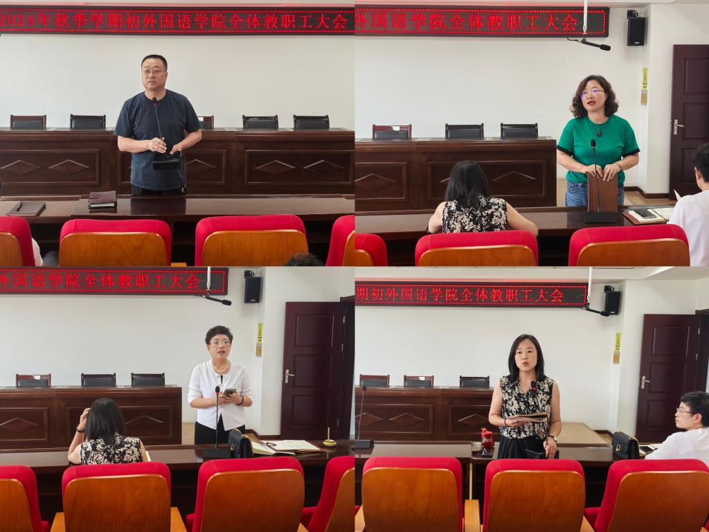 教学副院长王智音就新学期补考和监考相关事宜、学生论文抽检、本科教育教学质量提升、实习基地签订、教学团队建设、设立语言数据实验班等方面进行了工作说明。