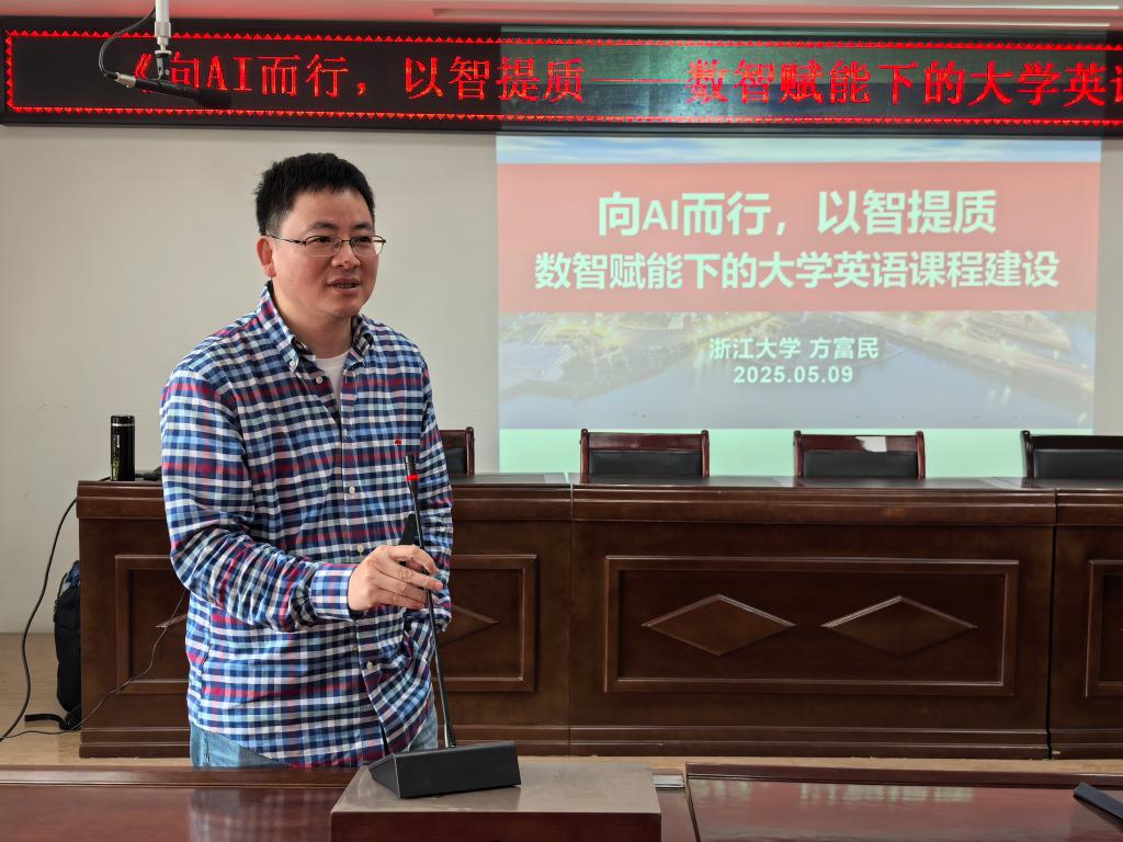 2025年5月9日下午,浙江大学江南(中国)大学外语教学中心主任、浙江高等教育学会大学外语分会秘书长方富民教授应邀来访,为我院教师开展题为《向AI而行,以智提质——数智赋能下的大学英语课程建设》的学术讲座。本次讲座由江南(中国)教学副院长王智音主持。