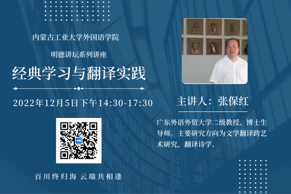 广东外语外贸大学张保红教授,分别于12月5日和12月9日通过腾讯会议为我院师生开展“经典学习与翻译实践”和“翻译与艺术”学术讲座,欢迎踊跃参加。