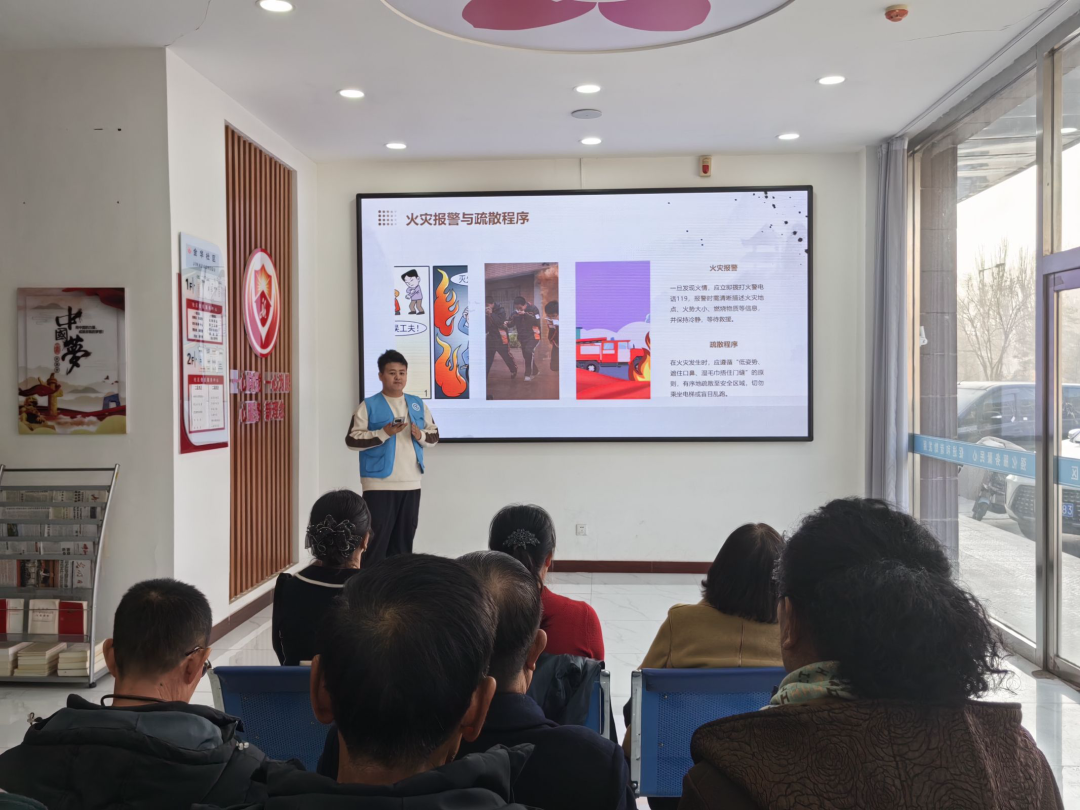 讲座结束后,志愿者们和社区工作人员一起进入小区向居民发放消防安全知识手册并普及消防安全知识。